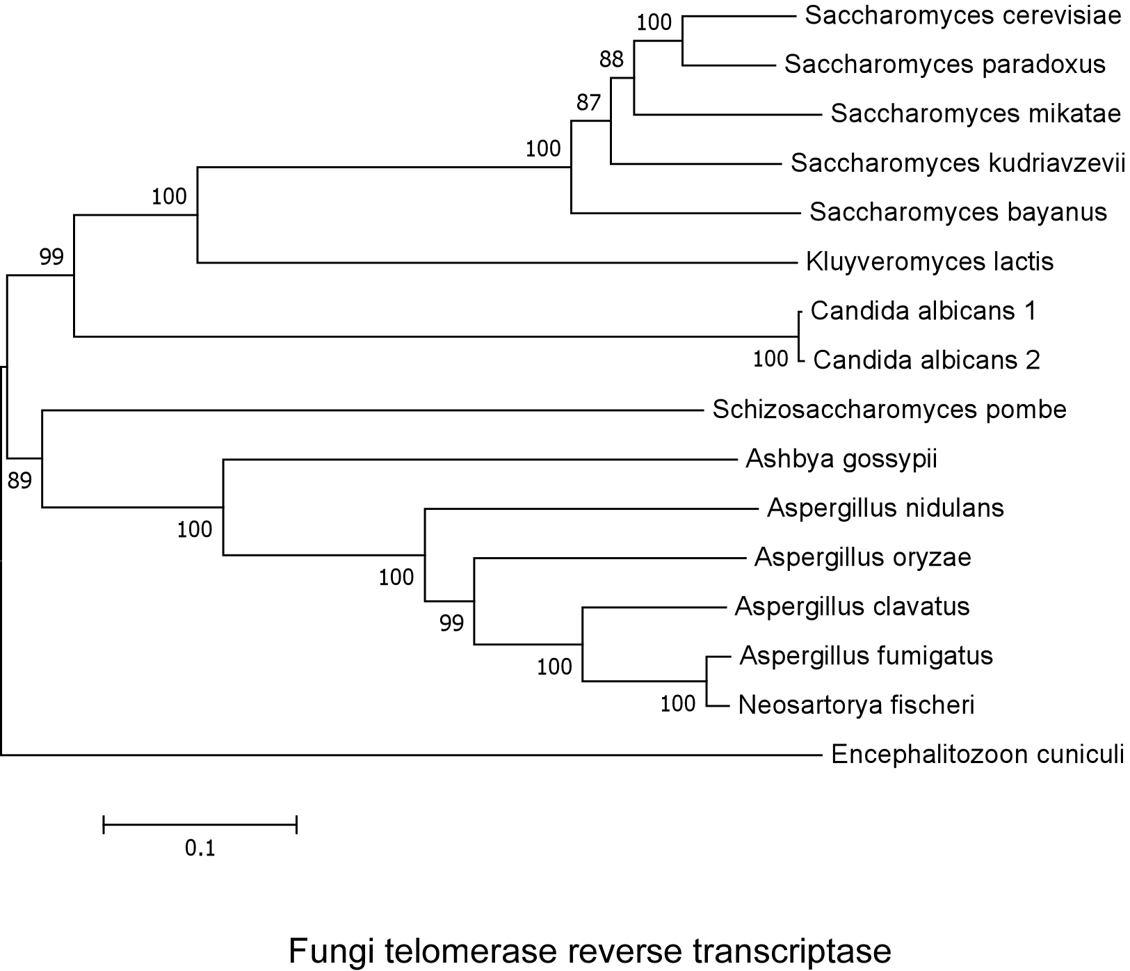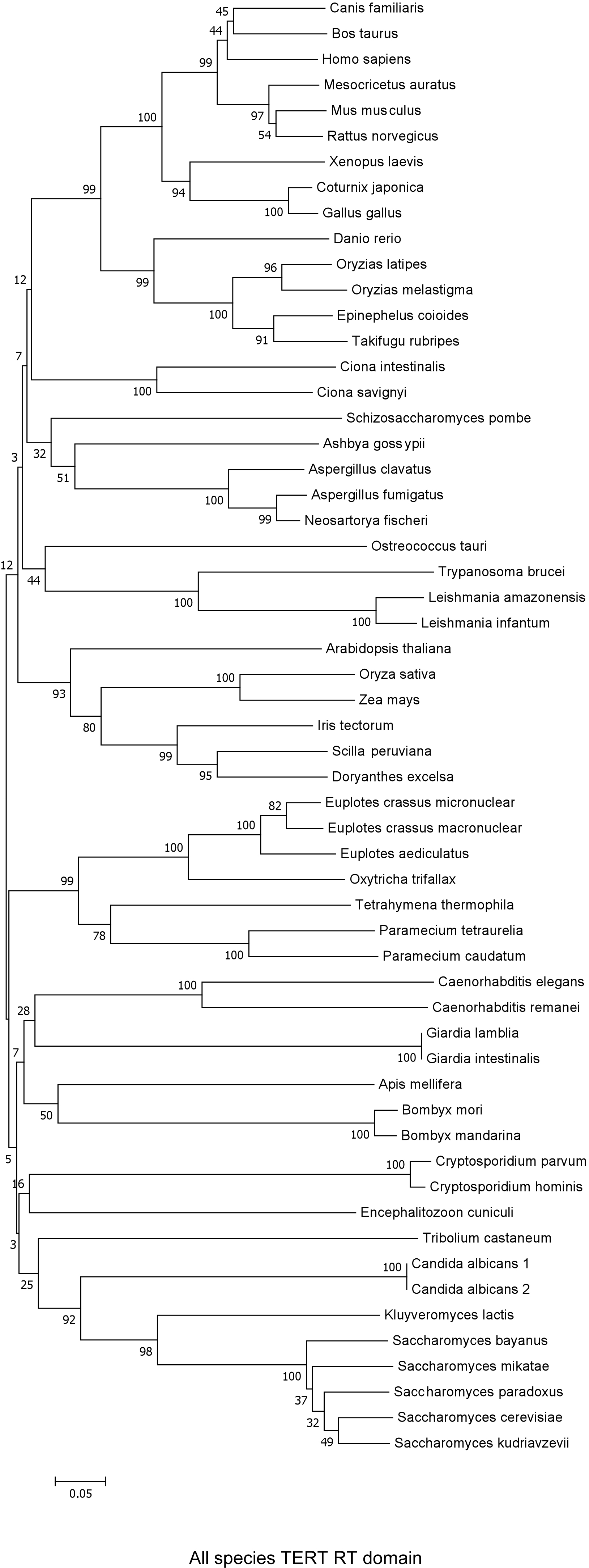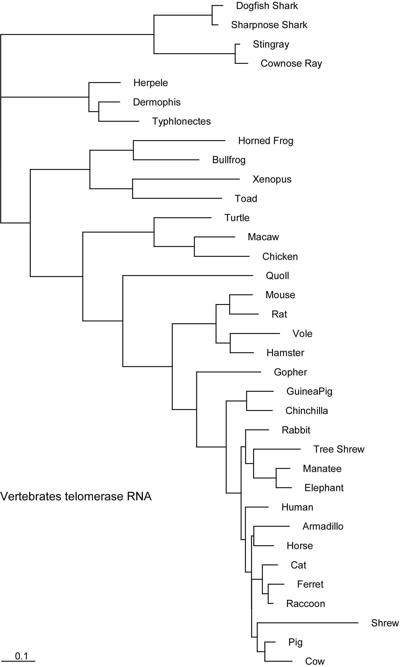 The RNA and protein sequence alignments were constructed from phylogentic comparison of conserved sequences and specific motifs. These alignments are comprehensive for the sequences available on the sequences page or as otherwise indicated. For the purposes of greater clarity and accuracy, incomplete, hypothetical, or otherwise unsubstantiated sequences have been excluded. The alignments of telomerase RNA (TR) component were separated into vertebrate, fungi, and ciliate. Where necessary these broad groups were sub-divided to account for variation in sequence, motifs identified, and structure. The protein alignments include telomerase reverse transcriptase (TERT) and telomerase-associated proteins based on the human model of the holoenzyme. Within the alignments, the sequences are annotated, the species are grouped by taxon, and sub-divided where necessary into separate alignments. Phylogenetic trees were constructed from the sequence alignments for evolutionary relationships.