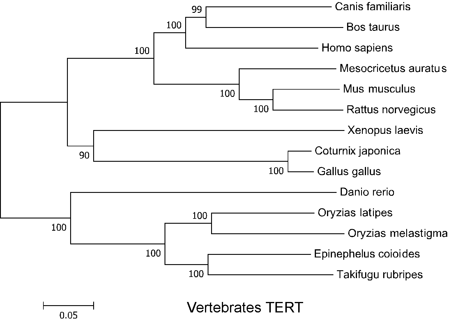 All alignments were constructed by the bootstrap method in the program BioEdit v7.0.9, with manual manipulations where necessary. One thousand neighbor-joining replicates were performed for each bootstrap analysis. The vertebrate TR phylogenetic tree was constructed by the maximum-likelihood method using the DNAML program from the PHYLIP package v.3.66. Shark and ray sequences were designated as the outgroup in the analysis. All other phylogenetic trees were constructed by the bootstrap method in the program MEGA 4.0. One thousand neighbor-joining replicates were performed for each bootstrap analysis.