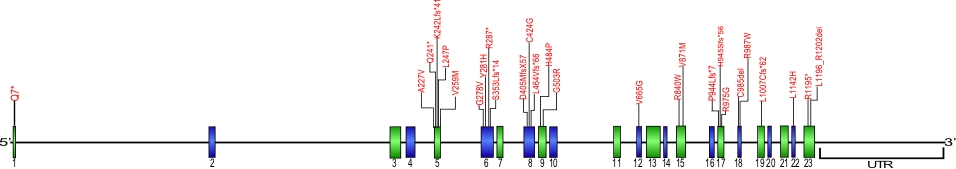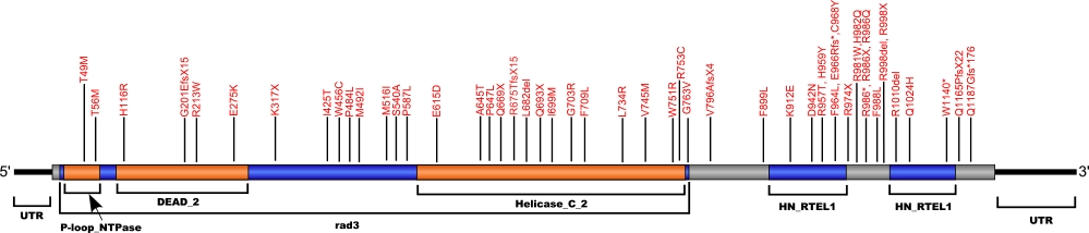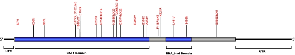 The above structural organizational scheme for the various motifs with the three domains of the TERT protein has indicated the locations of mutations known to cause human diseases. The black line represents the mRNA sequence of 4015 nt with the untranslated regions (UTR) labeled and the grey box corresponds to the protein sequence. The individual motifs are labeled and NTE is denoted by green, CTE by orange, and the central RT domain by blue boxes. The Genbank accession numbers used are