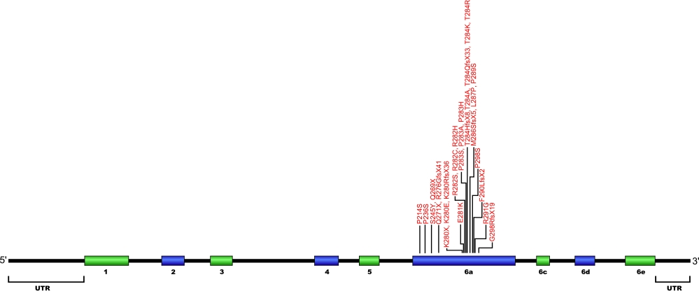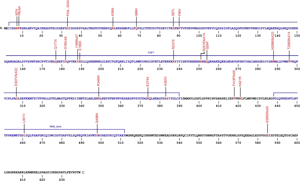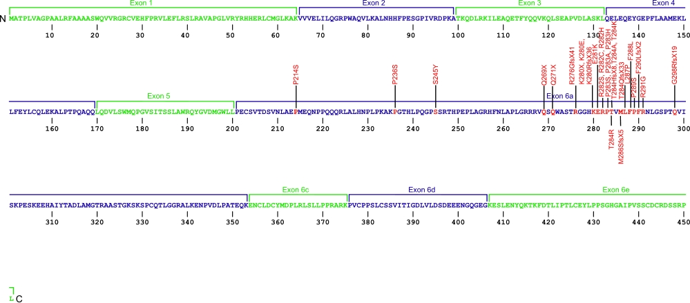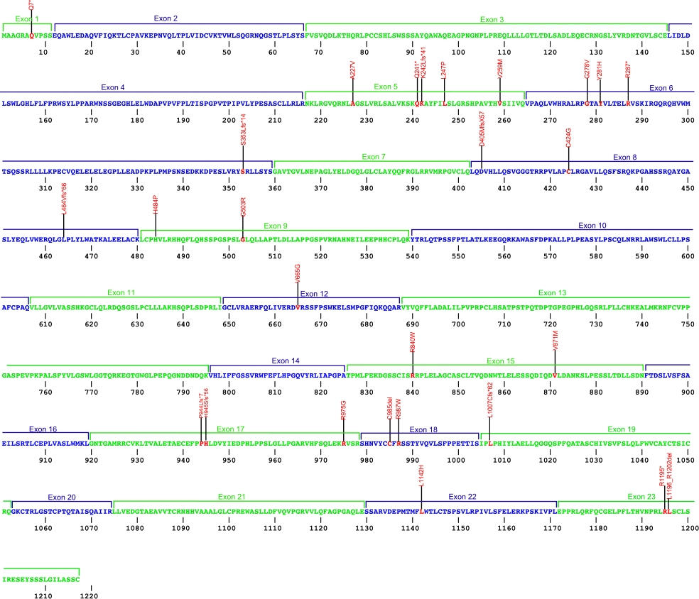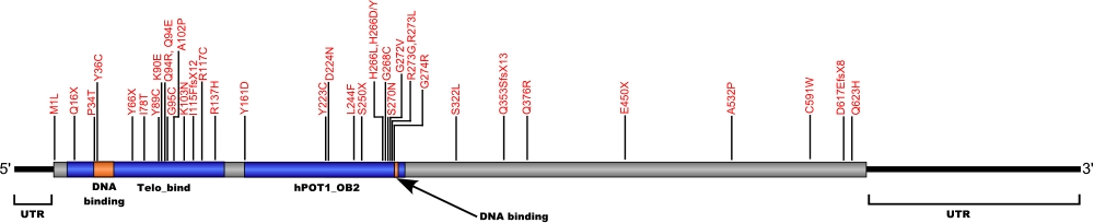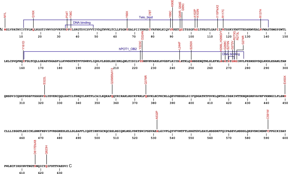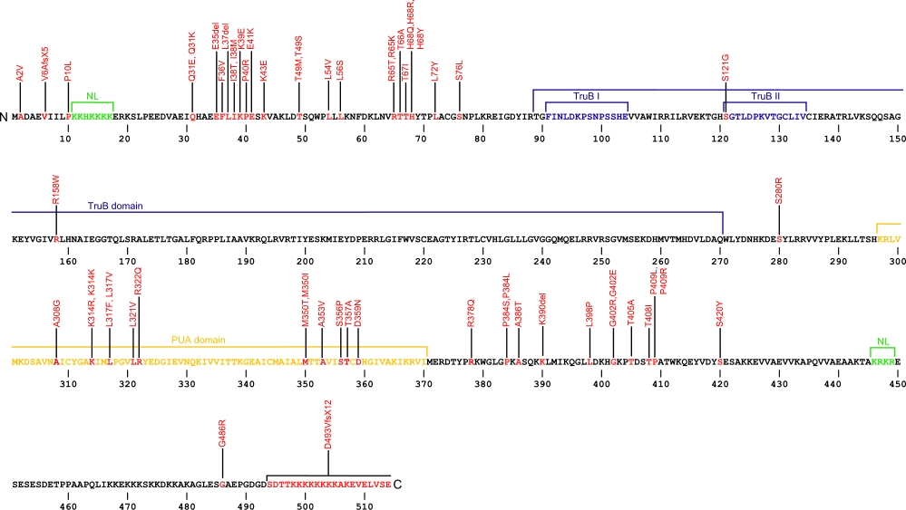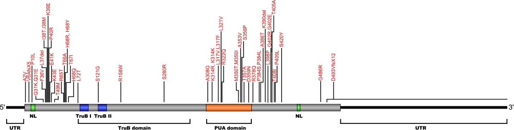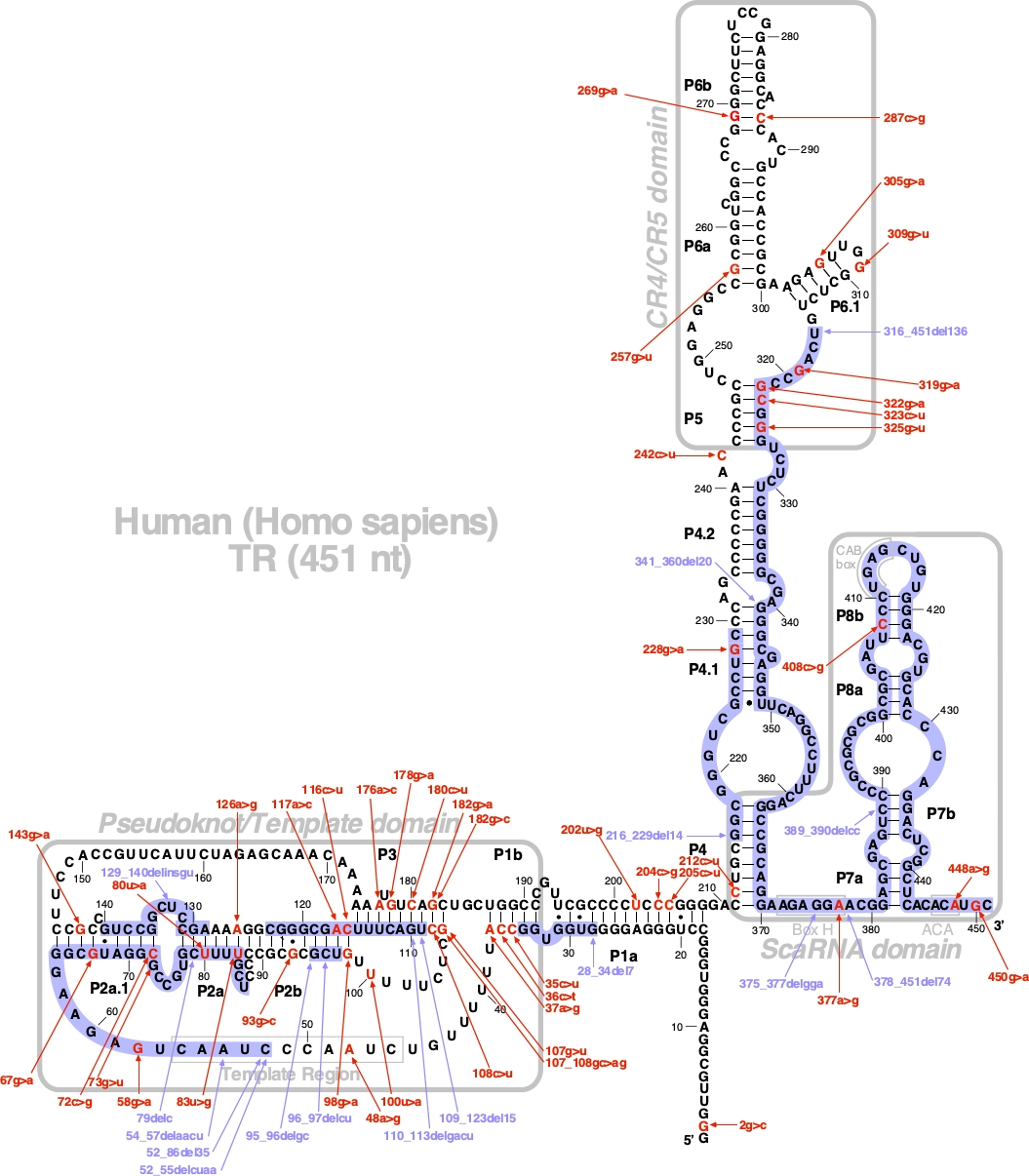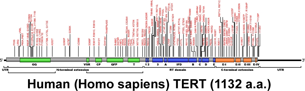 Below is a description of the locations within the nucleotide and protein sequence, the amino acid substitutions, the characteristic clinical presentations, and original literature citations that are linked to the published online journal for known mutations within the telomerase protein TERT. The cDNA sequence is used for the nucleotide sequence. The mutations are organized by domain from the N-terminus to the C-terminus and grouped by domain.