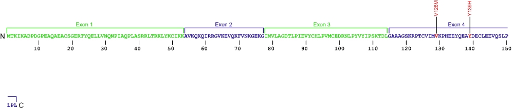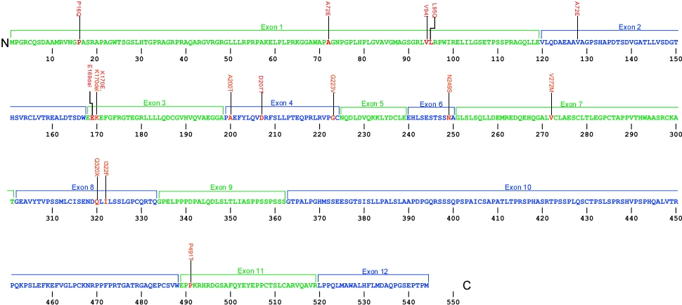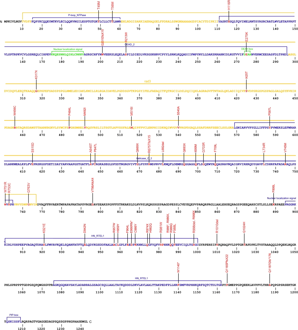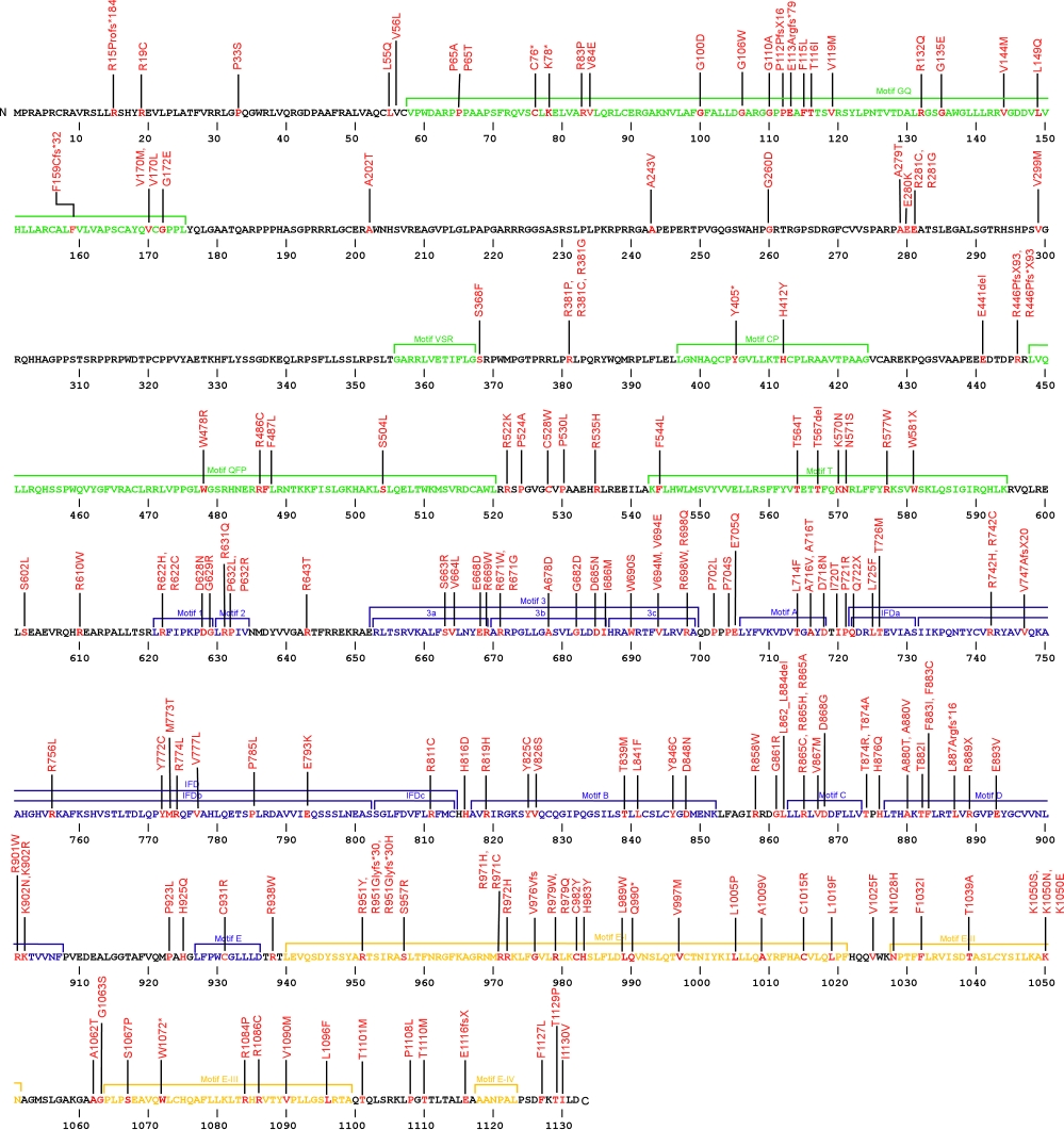 NM_198253 for the cDNA and amino acid sequences. Below is the 1132 amino acid sequence for TERT protein with the motifs labeled and colored by domain. The mutated residues are colored red and the change in amino acids is labeled.