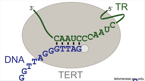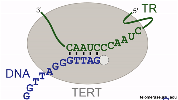 BREIF BACKGROUND Discovered by Carol Greider and Liz Blackburn in 1985, telomerase is a unique ribonucleoprotein (RNP) enzyme that adds telomeric repeats to the 3' end of chromosomes to counteract the DNA degradation that occurs due to the end replication problem. The Telomerase RNP contains two essential core components, the telomerase reverse transcriptase (TERT) and the telomerase RNA (TR), along with other species-specific telomerase associated proteins. The TR component contains a template region that is complementary to the telomeric DNA sequence, while TERT contains the catalytic reverse transcriptase domain responsible for nucleotide addition. The TERT and TR components are sufficient to reconstitute activity in vitro, however a variety of species-specific proteins are necessary for telomerase function in vivo and are thus thought to be involved in the regulation and biogenesis of telomerase. Telomerase is active in immortal cells such as germline and stem cells. Telomerase activity is also found in more than 85% of tumors making it a potential drug target for cancer therapy. Moreover, mutations in telomerase genes have been associated with a multitude of diseases including aplastic anaemia, dyskeratosis congenita, and idiopathic pulmonary fibrosis. ANIMATION The telomerase reaction within vertebrates and ciliates is processive, iteratively adding hundreds of telomeric repeats onto the DNA strand. During a processive reaction, the DNA strand (blue) anneals to the alignment region in the TR (pink), the catalytic TERT protein (grey) reverse transcribes the RNA template (red), adding 6 deoxyribonucleotides (blue) to the DNA strand. After extension, the DNA dissociates from the RNA and the newly synthesized DNA (blue) anneals to alignment region in the TR (pink), ready for reverse transcription to occur. |